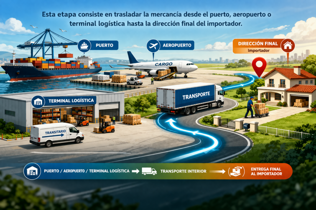 Esta etapa consiste en trasladar la mercancía desde el puerto, aeropuerto o terminal logística hasta la dirección final del importador.